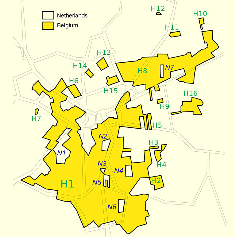 問題就來了。布拉邦家族(House of Brabant)是比利時陣營,而拿索家族(House of Nassau)則是荷蘭陣營。然而,他們擁有的土地和物業,都與對方混在一起,十分錯綜複雜。三十年戰爭後奠定了主權國家的崛起,荷兩國間因此為這些複雜飛地誰屬問題展開了曠日持久的討論,直至一九九五年才把最後一塊沒人擁有的土地劃給比利時。